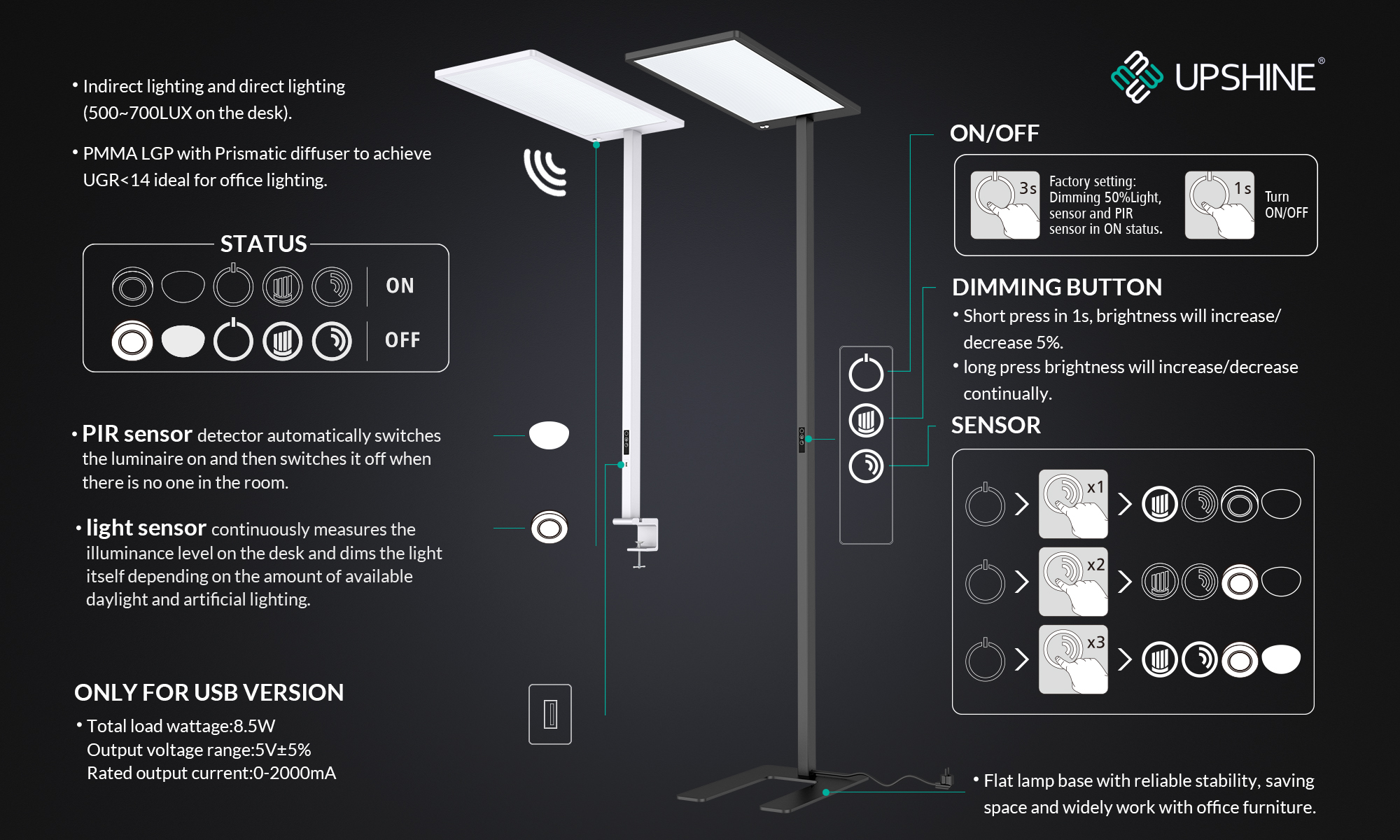 Der Leuchtenmast ist ausgestattet mit: Netzstecker, berührbarem 0–10 V-Dimmer, Lichtsensor, PIR-Bewegungssensormodul sowie USB-Anschluss. Die Konfiguration der Leuchte erfolgt per Knopfdruck und arbeitet anschliessend vollautomatisch. Die Lichtsteuerungsmodule sind austauschbar, wodurch sich die Leuchte ideal für moderne Büroumgebungen eignet.